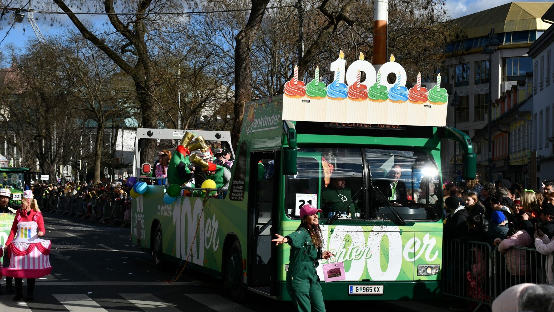 Der „Ankünder“ funktionierte für den Umzug einen Cabriobus der Graz Linien zum „100 Jahre-Bus“ um – und das gefiel den Juror:innen, aber auch den Besucher:innen des Umzuges sehr gut.