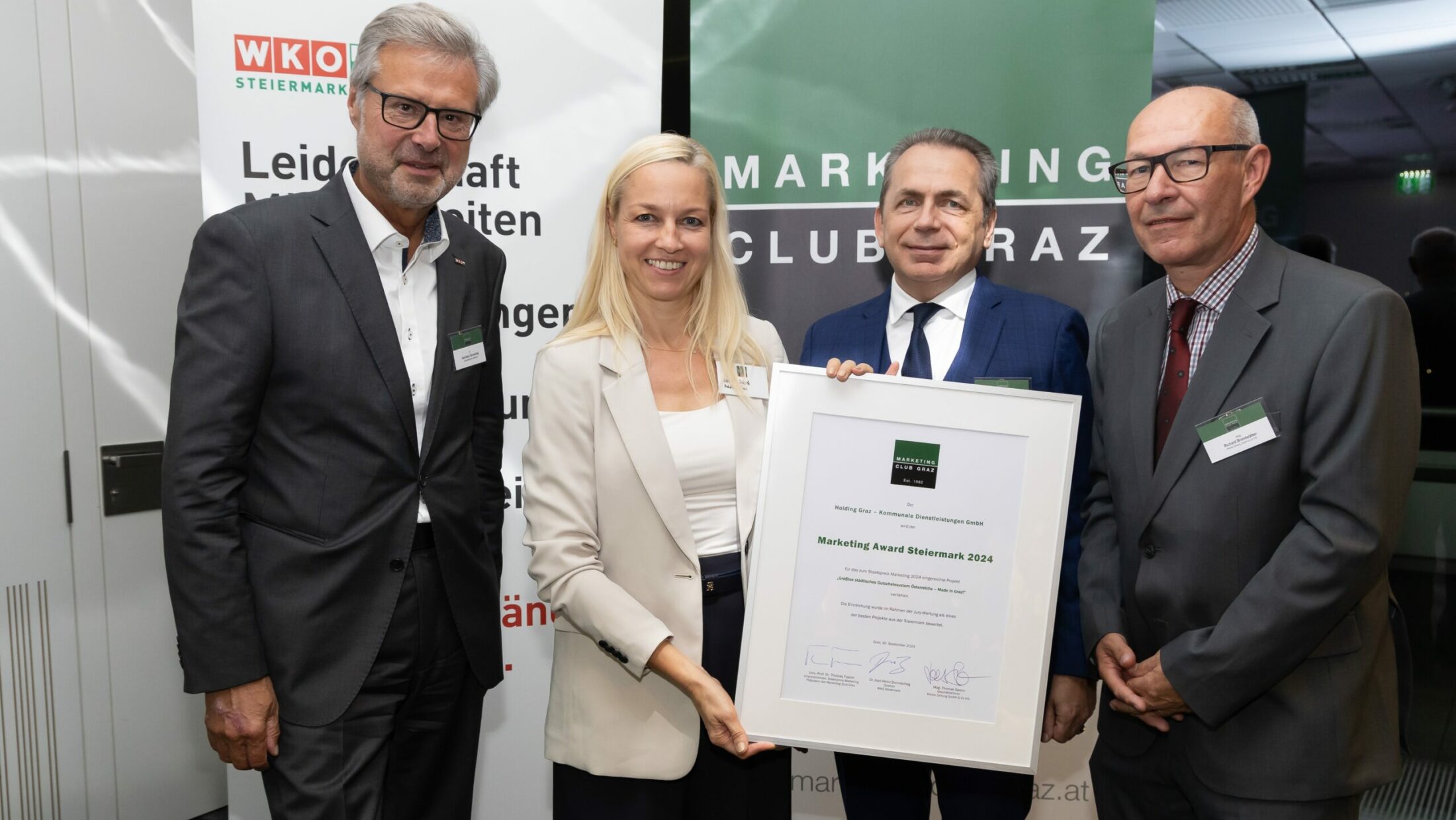 Gesucht wurden Unternehmen, die durch außergewöhnliche Marketingstrategien ihre Wettbewerbsfähigkeit stärken und dabei Nachhaltigkeit sowie Wertorientierung in den Mittelpunkt stellen. Der Holding Graz wurde dabei der „Marketing Award Steiermark 2024“ in der Kategorie „Public Services & Non-Profit Organisationen“ verliehen. Eingereicht wurde unter dem Titel „Größtes Österreichisches Gutscheinsystem – Made in Graz!“.