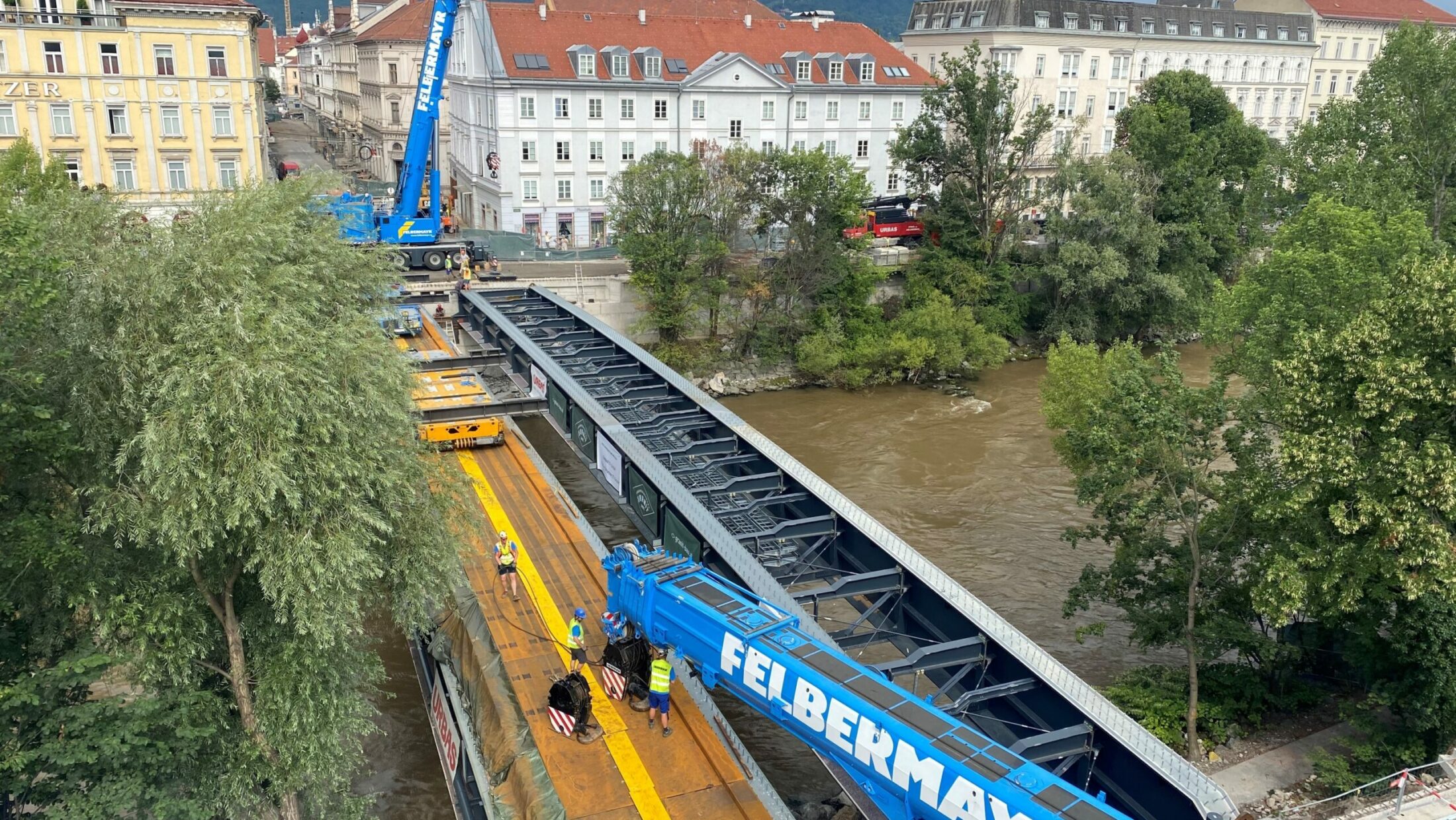 Mit Fertigstellung der Montagearbeiten wurde das 64 Meter lange, 3 Meter hohe und 6 Meter breite Tandem Nord am Freitag, dem 12.7.2024 ab 20 Uhr von Spezialtransportern zur Tegetthoffbrücke gebracht. Am Samstag, dem 13.7.2024 wurden zwei Spezialkräne (am Marburger Kai und am Grieskai) antransportiert und aufgebaut. Diese zwei Kräne hoben das Tandem dann am Sonntag, dem 14.7.2024 ab 7 Uhr in die zukünftige Lage.
