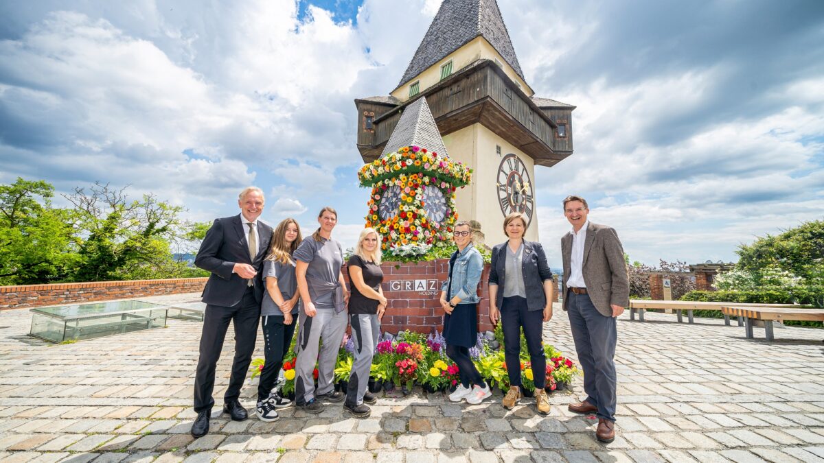 Der bunte Blumenuhrturm ist in den letzten drei Jahren zu einem beliebten Fotomotiv bei Grazer:innen und Tourist:innen geworden. Nach Standorten am Mariahilfer- und Schlossbergplatz ist er in diesem Jahr zum „echten“ Uhrturm übersiedelt. Mit dem bunten Blumenuhrturm haben die Mitarbeiter:innen aus dem Grünraum der Holding Graz eine besondere Installation geschaffen, so Bürgermeisterin-Stellvertreterin Judith Schwentner, Wirtschaftsstadtrat Günter Riegler und Holding-Vorstand Gert Heigl.