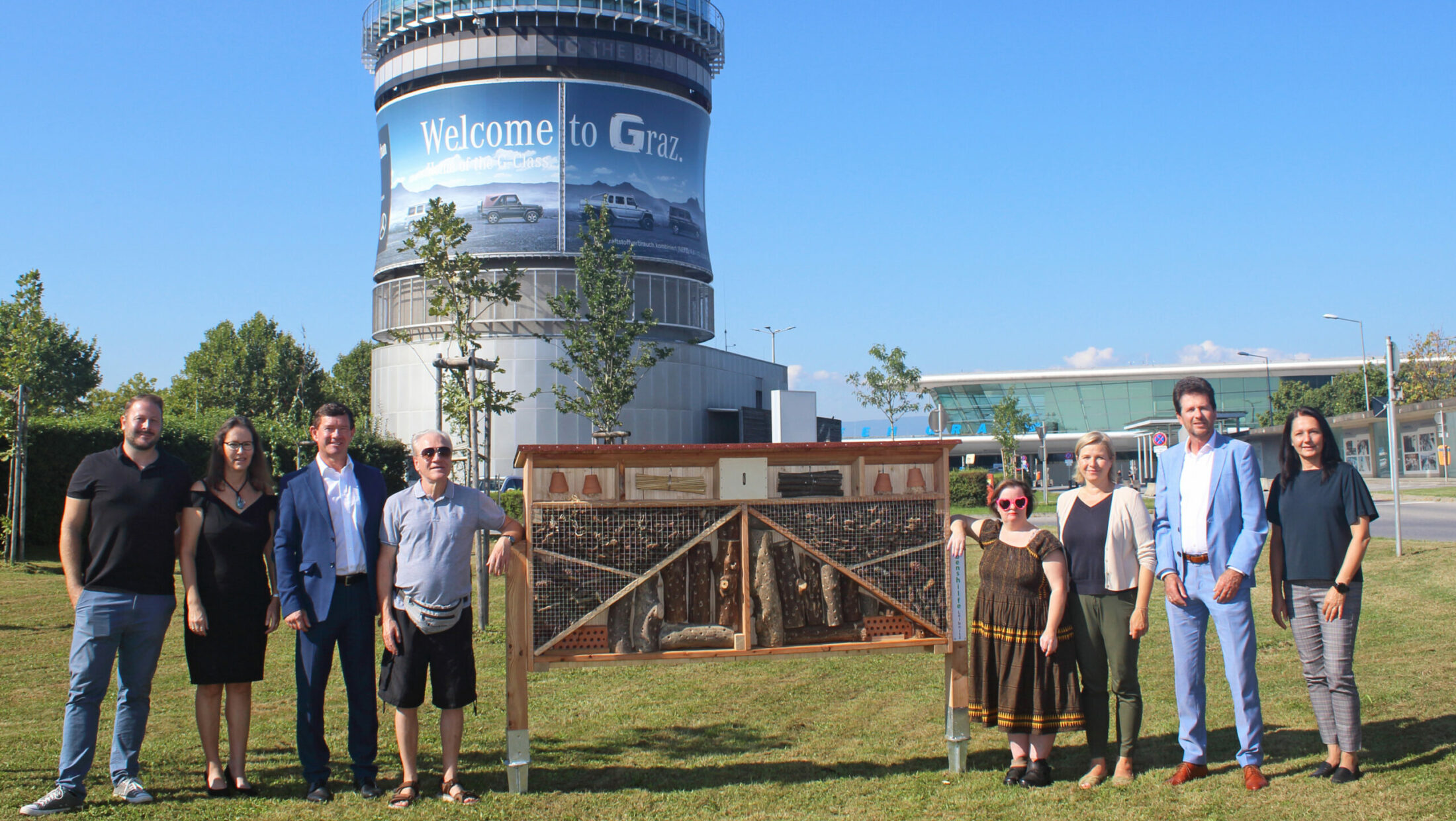 2022 entstand am Flughafen Graz die erste Ökoprofit-Baumallee in der Nähe des Towers. In diesem Jahr bekam die Allee Zuwachs. Zwei der Insektenhotels wurden in ihrer unmittelbaren Nähe aufgestellt.