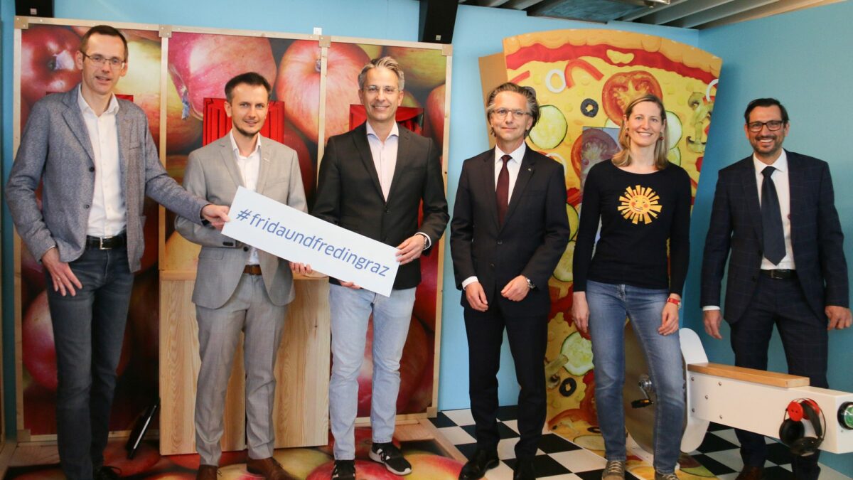 Foto oben/v.l.: Oliver Kröpfl (Vorstandsmitglied Steiermärkische Bank und Sparkassen AG), Richard Peer (Marketingleiter Holding Graz), Kurt Hohensinner (Jugendstadtrat), Gernot Reiter (Generaldirektor-Stellvertreter Grawe), Manuela Raidl-Zeller (Geschäftsführerin SONNENTOR), Jörg Ehtreiber (Intendant „FRida & freD“)