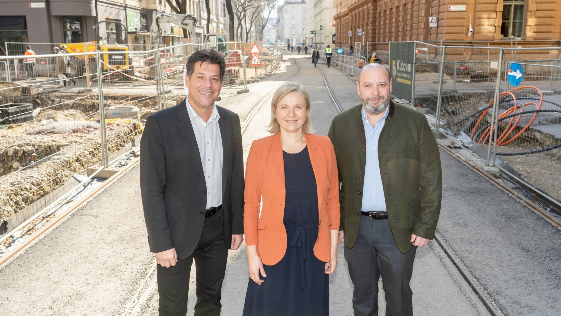 Foto oben: Bertram Werle, Judith Schwentner und Mark Perz auf der Baustelle in der Neutorgasse