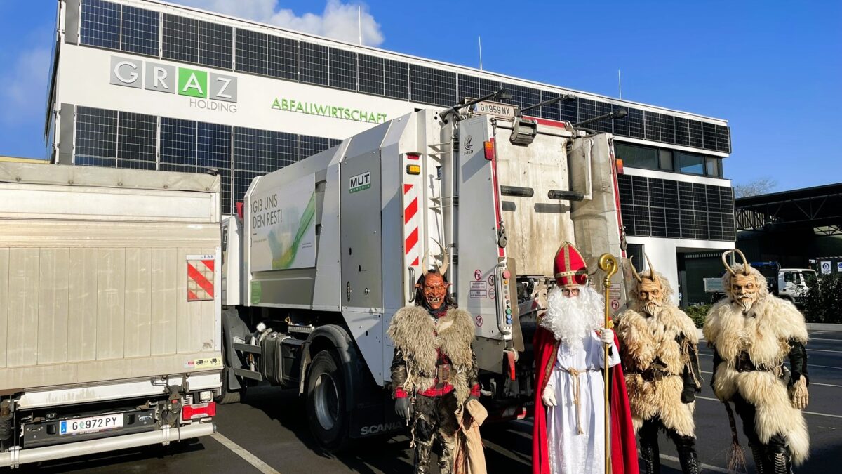 Hohen Besuch hatten unser Ressourcenpark Graz und unsere Abfallwirtschaft am 5. Dezember – da wurde er nämlich von einem Nikolo auf- und drei Krampussen heimgesucht. Das Ganze diente aber einem guten Zweck!
