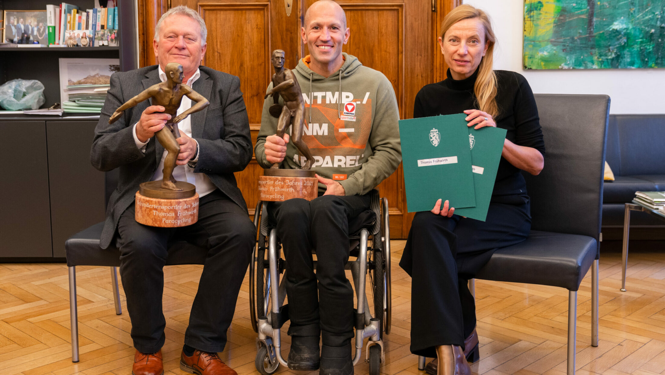 Für beide Jahre wurde der Paracycler Thomas Frühwirth als bester Behindertensportler ausgezeichnet. Die Kategorie wurde von der Holding Graz gesponsert, die Preisübergabe fand erst diese Woche im Büro von Sportlandesrätin Juliane Bogner-Strauß und in Anwesenheit von Holding Graz-CEO Wolfgang Malik statt. Wir gratulieren herzlich!