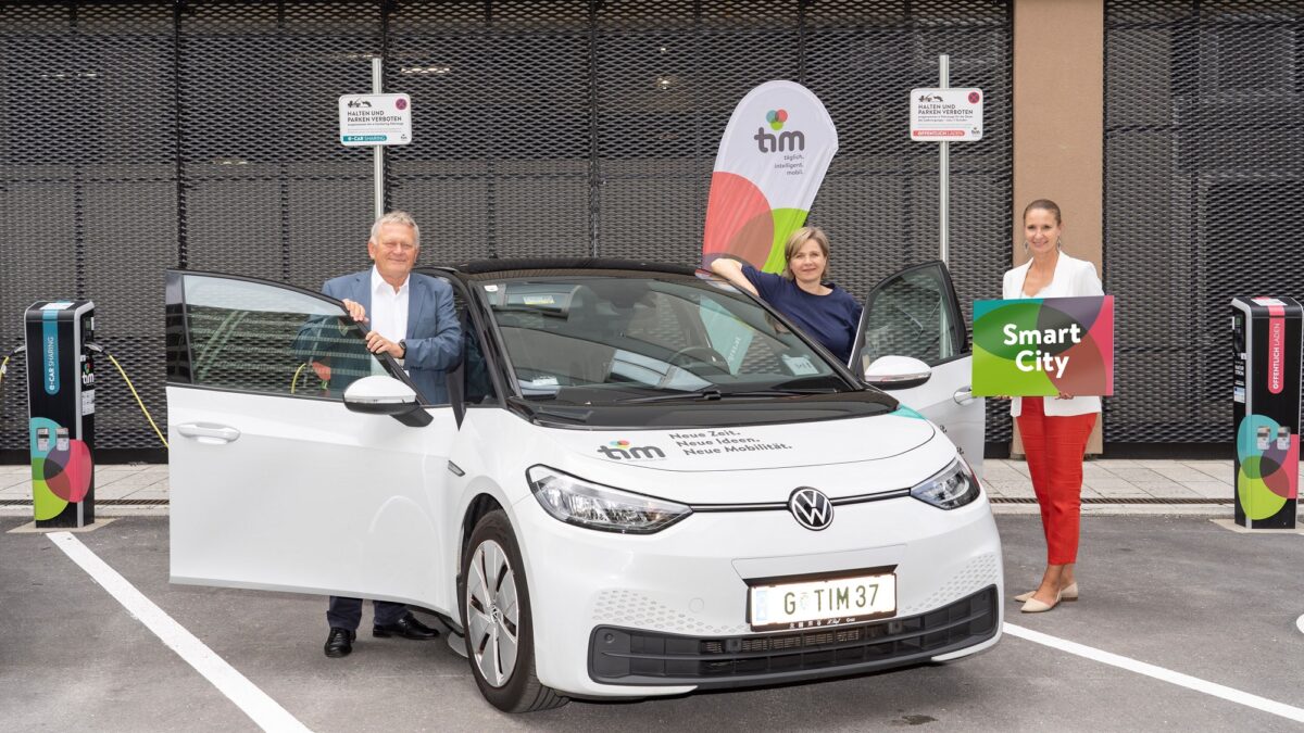 Foto oben: Wolfgang Malik, Judith Schwentner und Katharina Mayer mit einem tim-Auto am Standort Smart City