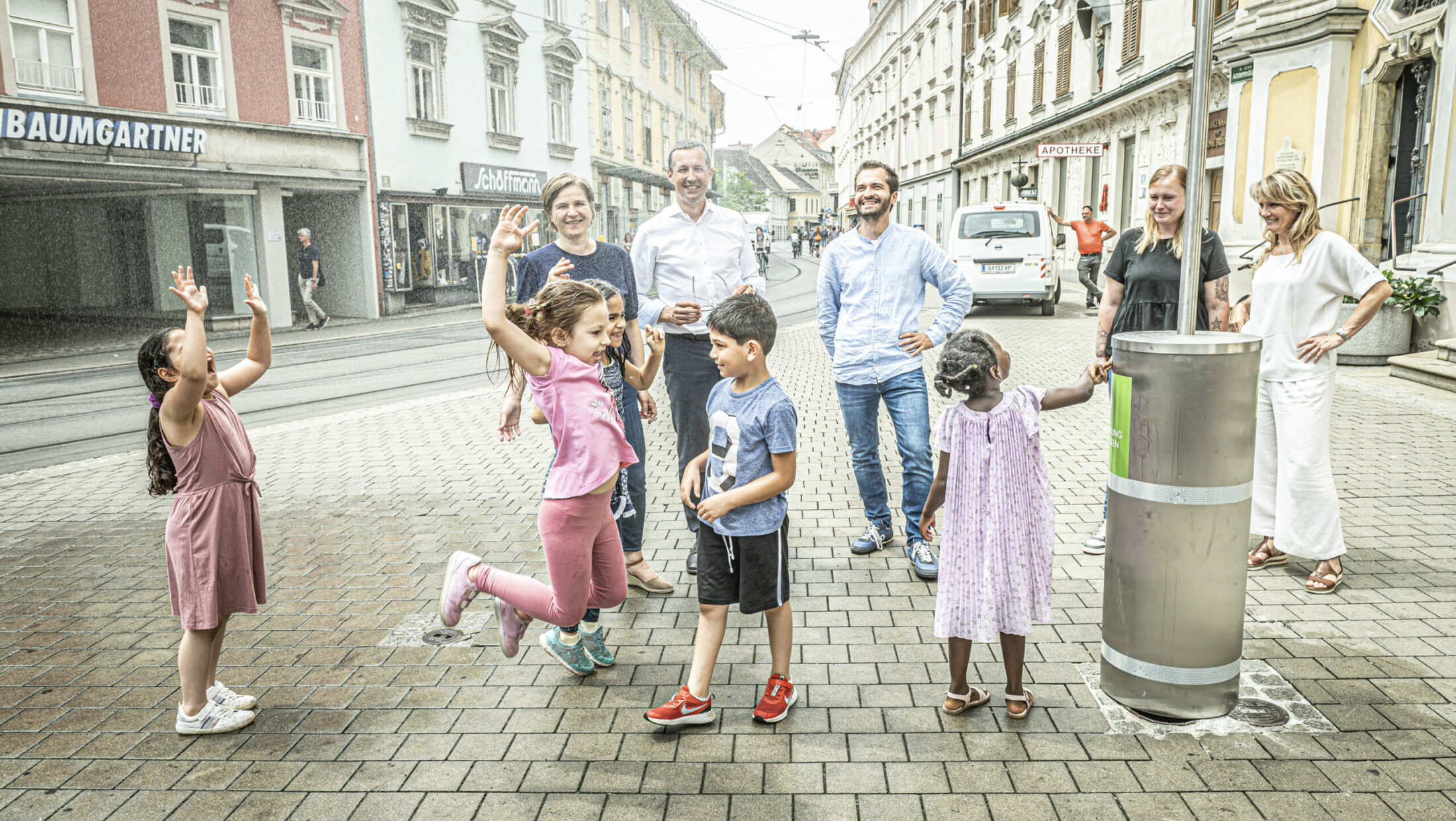 Auf (Wasser-)Wolke Sieben schwebten Mädchen und Buben des Kindergartens und Horts Dominikanergasse. Sie prüften die Sprühapparate nämlich als erste auf Herz und Nieren. Einhelliger Tenor: „Das ist so coooool!“, strahlten Mansata, Zobeid, Venus, Lena und Amina mit den Kindergartenpädagoginnen Carmen Paugger und Christina Markovic um die Wette und drückten immer wieder quietschvergnügt den Aktivierungsknopf, denn alles Gute kommt von oben …